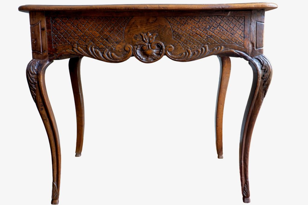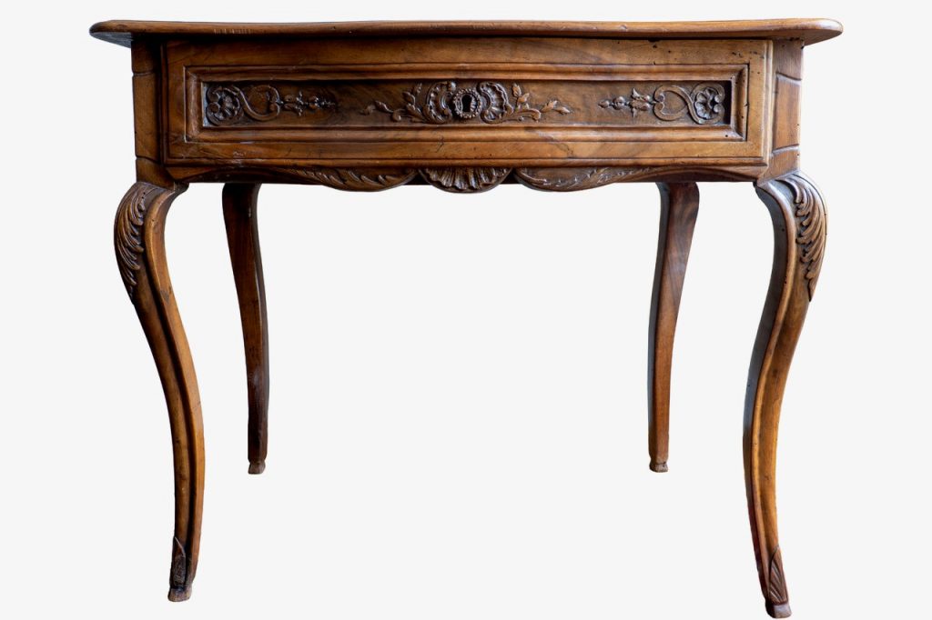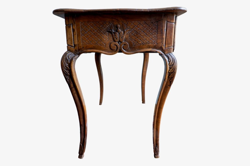Les meubles en bois naturel mouluré et sculpté ont été produits en grand nombre au cours du XVIIIe siècle pour divers usages (console, bureau plat, table de jeu, table à écrire…). La Provence, grâce à son climat chaud et sec, a favorisé la fabrication de meubles en bois naturel, dont les lignes sont souvent plus marquées que sur les modèles du nord de la Loire. Le bois de noyer a été couramment utilisé dans le sud-est de la France. Il a été réservé aux ouvrages les plus raffinés à Paris, où les rares meubles en bois naturel qui subsistent sont souvent entièrement réalisés en bois de hêtre ou combinés avec du bois de noyer. Ils ont été fabriqués par des menuisiers-ébénistes, pour les pièces les plus prestigieuses. Peu de modèles ont survécu aux affres du temps. À titre d’exemple, parmi les centaines de meubles en bois naturel livrés pour le Garde-Meuble de la Couronne tout au long du XVIIIe siècle, un seul a été identifié à ce jour. La Provence et la région lyonnaise ayant favorisé la production de ce type de meubles, les exemplaires subsistants sont plus nombreux.