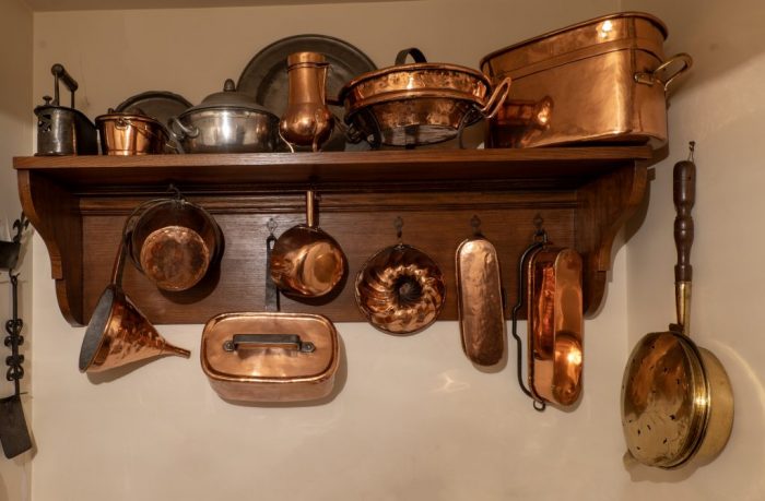 Cet ensemble exceptionnel de cuivres de cuisine vernis des XVIIe et XVIIIe siècles, d’étains de présentation du XVIIIe siècle et d’une petite dinanderie en fer du XVIIIe siècle, a été constitué au XXe siècle par un collectionneur pour la cuisine d’une demeure ancienne. Il est en excellent état de conservation.