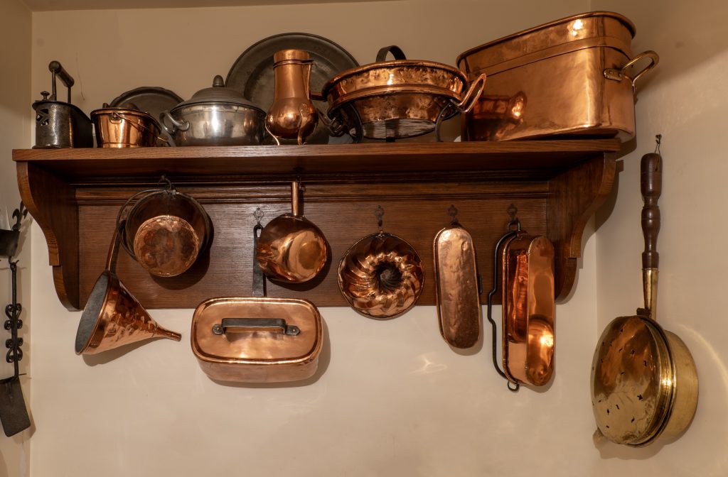 Voici une table provençale d’époque Louis XV et des cuivres datant pour partie du XVIIIe siècle et pour partie des deux premiers tiers du XIXe siècle. Ils ont été vernis et sont en parfait état. Les étains sont du XVIIIe siècle. La dinanderie avec ustensiles en fer date également du XVIIIe siècle, certains ustensiles étant plus anciens que d’autres (objet très rare).