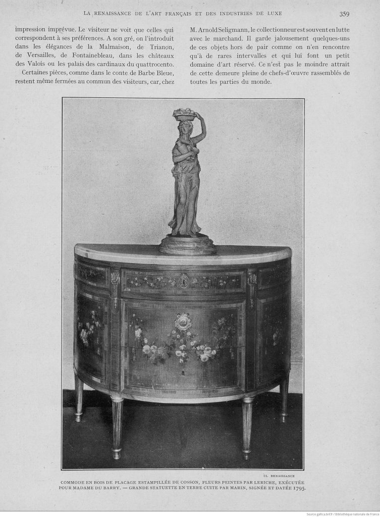 Notre commode jouit d’une provenance prestigieuse, ayant appartenu au célèbre antiquaire Arnold Seligmann. Elle est notamment représentée dans l’un des somptueux salons de son hôtel particulier situé Place Vendôme, comme en témoigne la publication « La Renaissance de l’Art Français et des Industries de luxe » de juin 1926 (pages 356-359). Cette publication attribue la réalisation de la commode à Madame Du Barry.